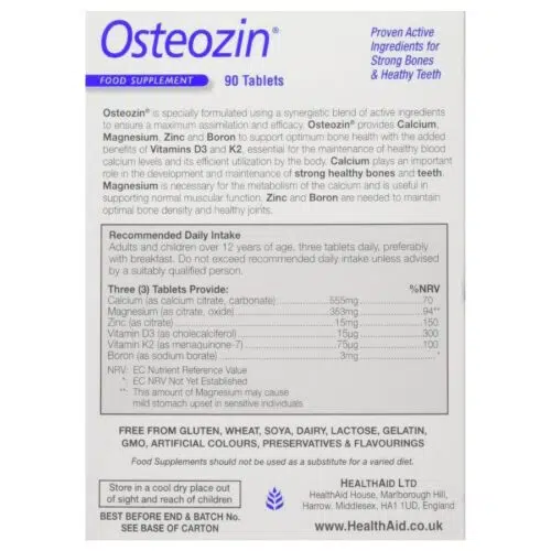 HealthAid Osteozin (New Bone Formula) 90’s VegiTabs combines essential vitamins and minerals to promote strong bones and joints. Manufactured using high-quality ingredients, this supplement is designed to meet the nutritional needs of active adults who want to maintain bone density and support a healthy lifestyle.