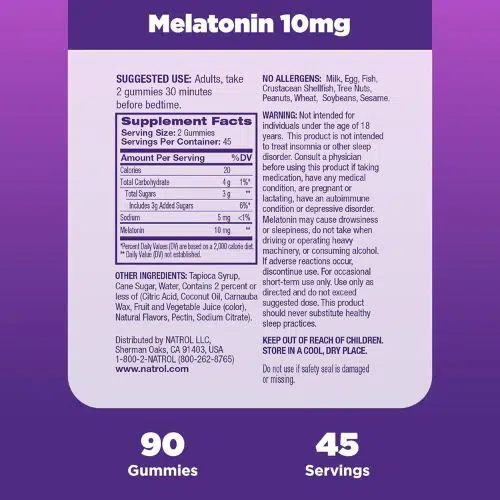 The Natrol Melatonin Gummies, Sleep Support for Adults, 10 mg Melatonin Strawberry-Flavored | 90 Gummies is a premium dietary supplement formulated to support healthy sleep patterns. Each gummy contains 10 mg of melatonin, a naturally occurring hormone that regulates your sleep-wake cycle.