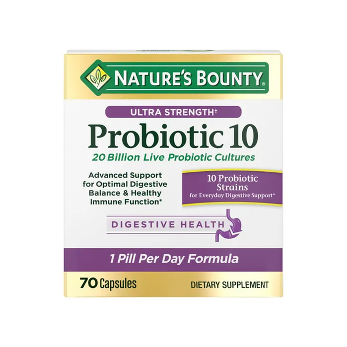 Nature’s Bounty Ultra Strength Probiotic 20 Billion-70 Capsules is formulated with 20 billion live cultures per serving to promote optimal digestive health. Made from high-quality, original ingredients, it ensures that every capsule delivers the potency you need to support your wellness goals.
